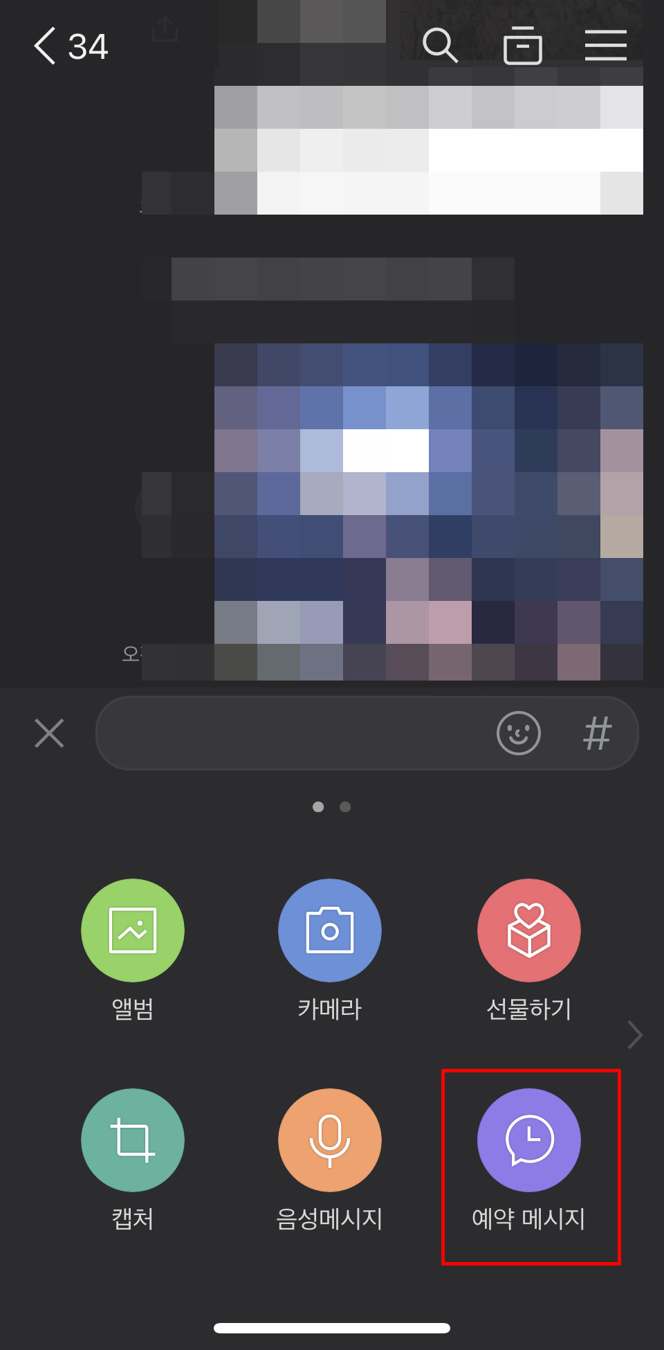 2.'+'버튼을 누르면 여러가지 익숙한 기능들이 있습니다. 이중에서 예약메시지 아이콘을 늘릭 해줍니다. 평소 자주 사용 했던 기능들인데, 유심히 보지 않아서 있는지도 몰랐던 분들이 많을 것 같습니다.