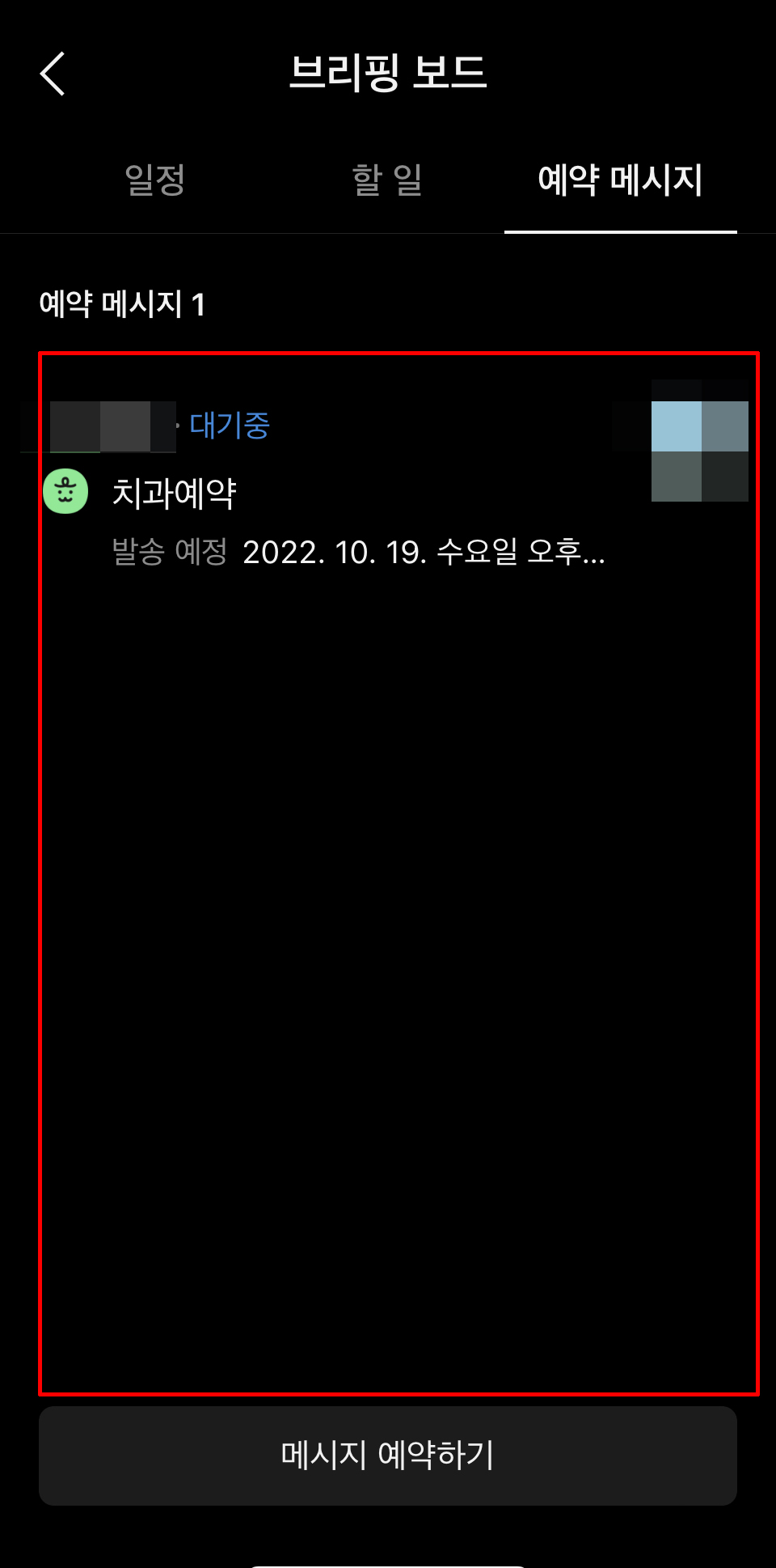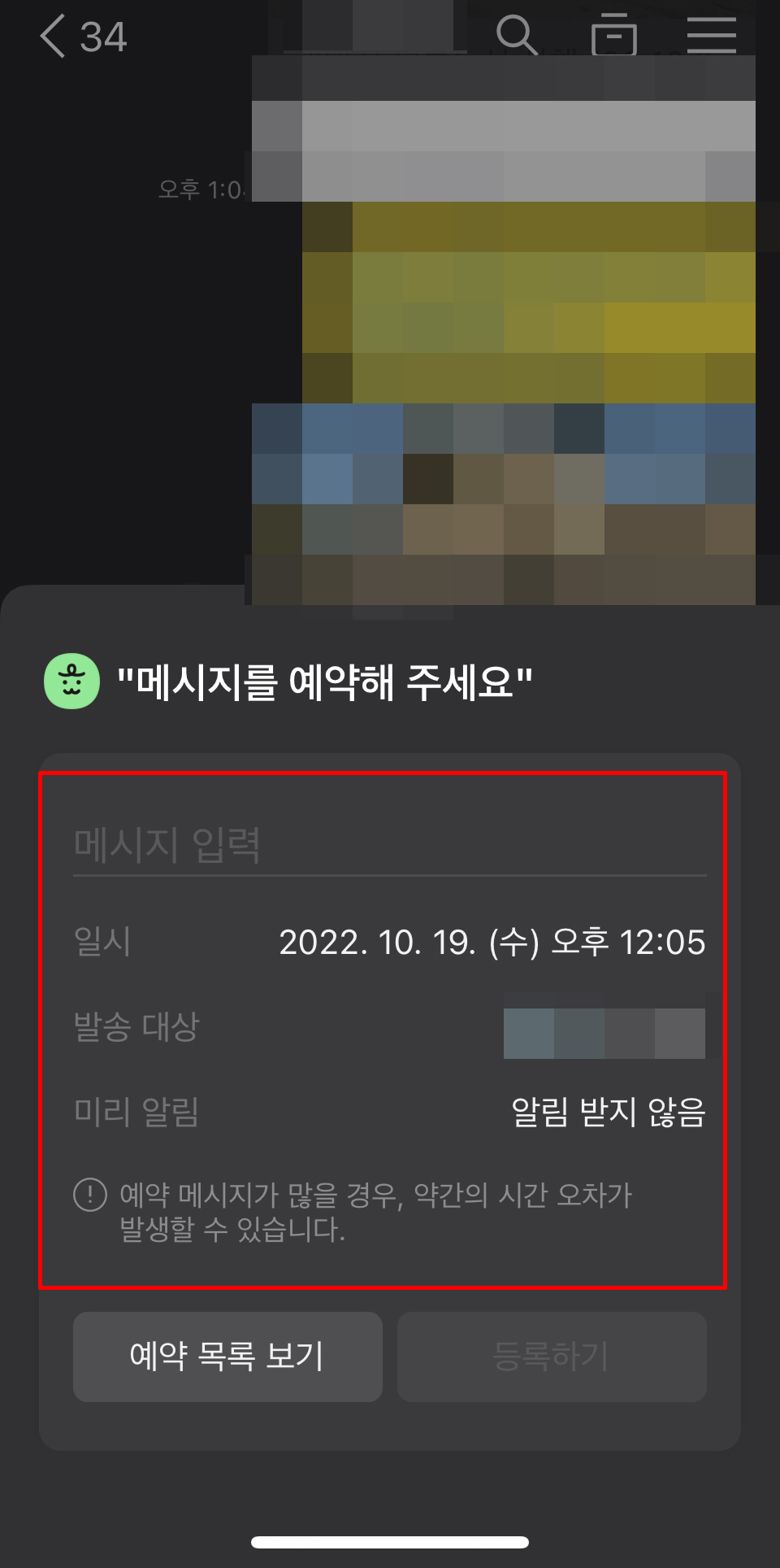 만약 나에게 보내는 메시지를 예약 하고 싶으면 나와의 채팅방에서 하면 되고, 상대방에서 예약을 하고 싶으면 상대방 채팅방에서 하면 됩니다.