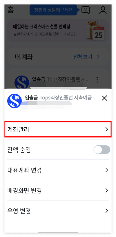 위와같이 해당 통장에 대한 작업을 할수 있는 메뉴들이 나옵니다. 이중에서 계좌관리를 클릭 해줍니다.