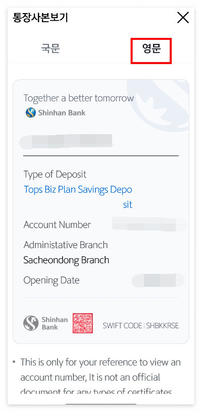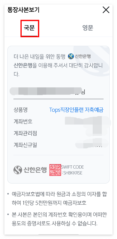 통장사본은 위와같이 국문 보기와 영문보기 두가지를 확인 하실 수 있습니다. 필요에 따라서 영문 필요한 경우는 영문을 클릭 해주시면 됩니다.