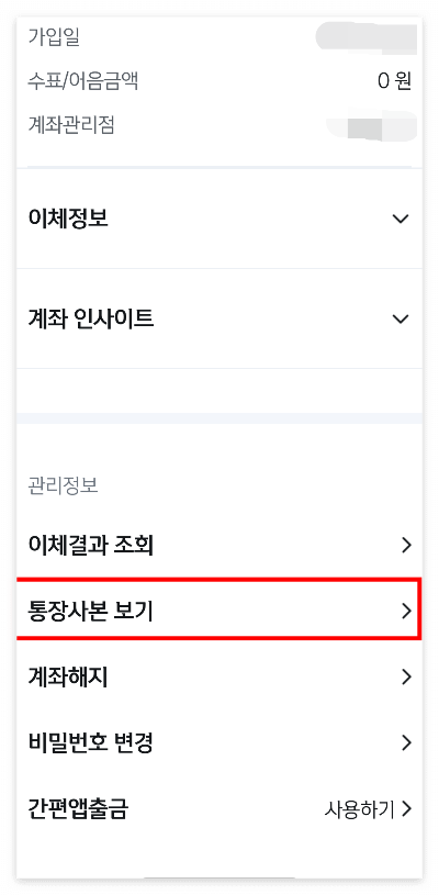 스크롤을 아래쪽으로 내리면 위와같이 이체결과조회, 통장사본 보기, 계좌해지, 비밀번호 변경 등의 작업을 할수 있는 메뉴들이 나옵니다. 이중에서 통장사본 보기를 클릭(터치) 해줍니다.