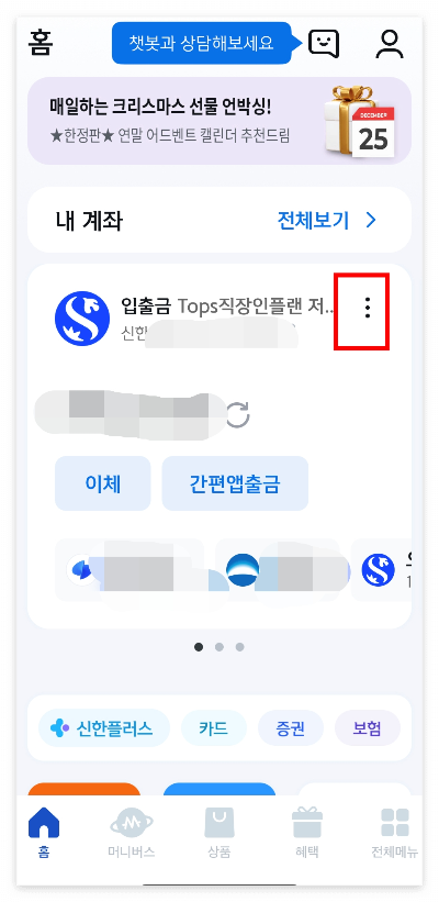 내가 통장사본을 출력하고자 하는 계좌번호의 오른쪽에 점세개 표시를 클릭을 합니다. 만약 메인화면에 출력하고자 하는 통장의 계좌번호가 표시가 되지 않는다면 [내 계좌 전체보기]를 클릭해서 찾으시면 됩니다.