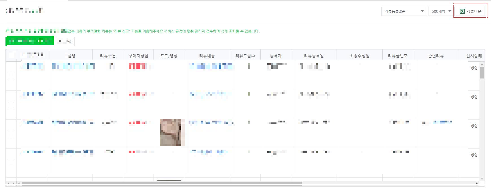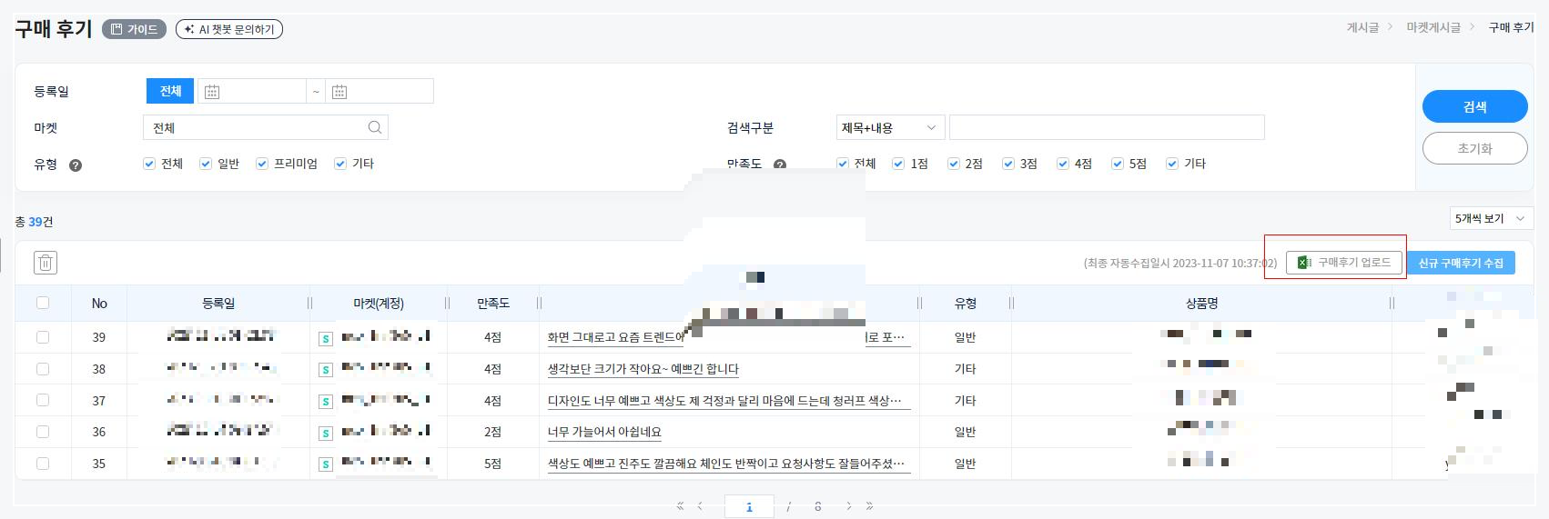 연동되어 있는 마켓(스마트스토어 이외 모든 마켓)과 연동되어있는 리뷰글이 전부 나오게 됩니다.