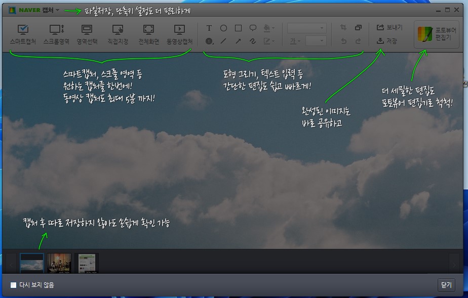 화면을 캡쳐하는 프로그램들은 무척 많이 있습니다. 지금까지 여러가지 프로그램을 써봤지만, 저는 지금은 공식사에서 제공하지 않고 있는 네이버캡쳐가 가장 편리하고 간결하다고 생각해서 지금까지 사용하고 있습니다.