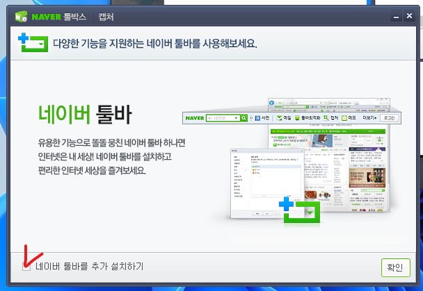 완료를 하게 되면 여기서도 네이버 툴바 추가 설치하기를 해제해준 후 확인 버튼을 누릅니다.